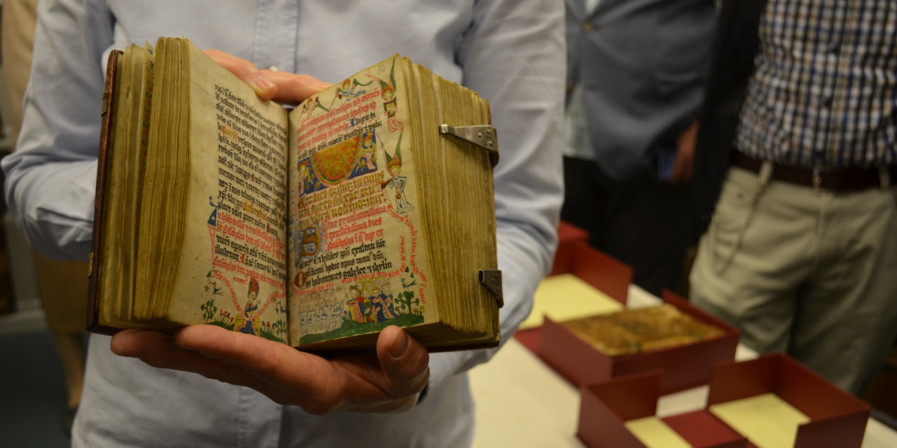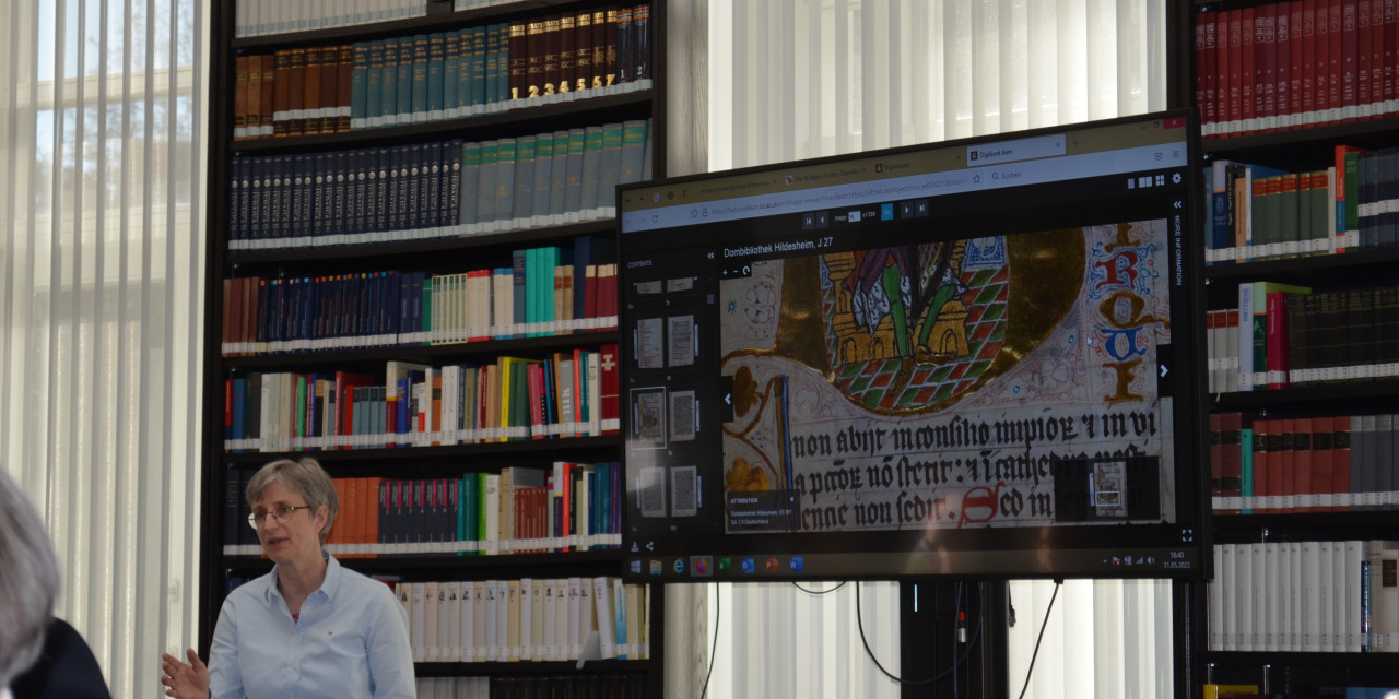 Dr. Suchan führte aus, wie Digitalisierung und Präsenz sich gegenseitig ergänzen und eine neue Qualität des Wahrnehmens und Verstehens ermöglichen. Im Mittelpunkt der Ausführungen standen zwei Gebetbücher des 15. Jahrhunderts aus dem zisterziensischen Frauenkloster Medingen bei Lüneburg, die für die Epoche in einer neuen spirituellen und künstlerischen Ausdrucksform individuell gestaltet, handgeschrieben und vielfach opulent mit Illustrationen versehen wurden. Die Handschriften sind digitalisiert und stehen im Netz zur Verfügung. Dadurch ist eine Betrachtung der Details möglich geworden, die vor der Digitalisierung so nicht angeboten werden konnte.