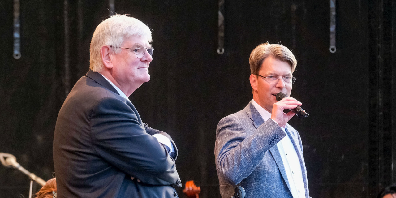Generalmusikdirektor Florian Ziemen führte anschließend tiefgründig in das Werk ein und wies auf die musikalische, politische und gesellschaftlich relevante Dimension hin. Beethovens Musik wirke in die Gesellschaft hinein, um sie zu verändern und als Schwester und Brüder zu leben. “So können wir leben: Diese Vision feiert Beethovens Neunte.” Dann sind alle eingeladen unter dem Dirigat von Dommusikdirektor Thomas Viezens gemeinsam “Freude schöner Götterfunken” zu singen. Das Publikum war begeistert.