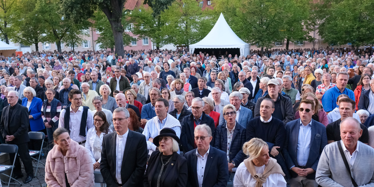 Die Menschen strömten auf den Domhof, saßen auf Stühlen, auf Bänken, auf den Stufen vor dem Dom, auf den Stufen der umliegenden Häuser oder auf mitgebrachten Gartenstühlen. Besucherinnen und Besucher jeden Alters konnten begrüßt werden. Voll Vorfreude wurde schon einmal mit einem Gläschen angestoßen.