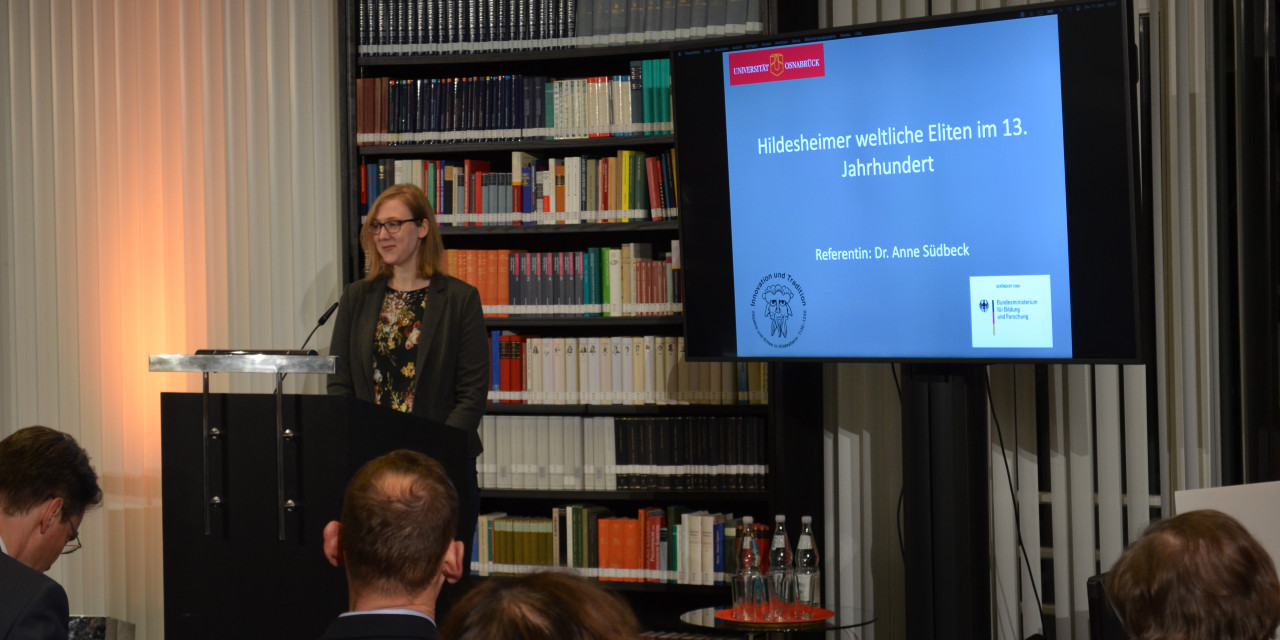 Untersucht hat die Autorin Dr. Anne Südbeck die komplexen Verbindungen der städtischen und klerikalen Eliten vor allem in Bezug auf den Dom, die Domschule und das Domkapitel. Dr. Anne Südbeck hält ihren Vortrag mit dem Titel „Die städtischen Eliten Hildesheims im 13. Jahrhundert”. Die Publikation zeigt damit die Wurzeln der engen Verbundenheit der Bürgerschaft mit den geistlichen Einrichtungen und besonders dem Dom auf, was Frau Dr. Südbeck eindrucksvoll und anhand einer Präsentation erläuterte. Die anschließende Möglichkeit, Fragen zum Vortrag zu stellen, wurde seitens der Mitglieder rege genutzt. Dr. Ingo Meyer dankte Frau Dr. Südbeck herzlich für den beeindruckenden Vortrag.