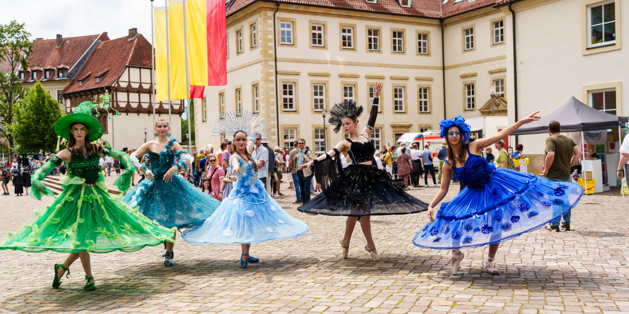 Große Aufmerksamkeit bei Groß und Klein erzielten die Tänzerinnen und Tänzer sowie die schillernden Walking Acts von Ars Saltandi, die ein buntes Programm aus Choreographien, Tanz und Akrobatik zeigten oder mit blauen, grünen oder weißen Kostümkreationen förmlich über den Domhof schwebten.